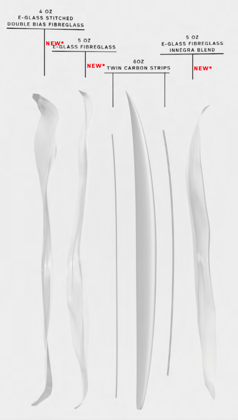| 構造 | デッキ: *テールVパッチ *1 x 5oz または6oz ファイバーグラスモ(モデルにより異なります) *1 x 220g バイアックス ファイバーグラス *1) *1 x ツインテック カーボンストリップ *EPS フォーム ボトム: *1 x 5oz ファイバーグラス+ チリシグニチャー ブラックライン *1 x ツインテック カーボンストリップ *フィンパッチ
